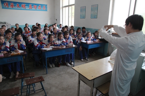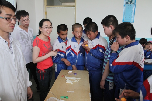 仪式结束后,我所先期参与支教的8名研究生为小学生们做了励志讲座和科普讲座,并为大家演示了神奇的字迹、魔棒电灯、试管吹气球、神奇的“蛋悬浮”等丰富有趣的科学小实验。同学们热情高涨,踊跃提问,争先参与各种互动游戏。