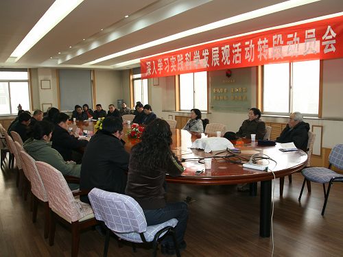 1月15日下午,我所组织召开学习实践活动转入解决问题、完善机制第三阶段动员会。山西省委学习实践科学发展观活动第九指导检查组韩晋乐同志出席会议。所领导、机关各处室负责人及各总支、支部书记、委员25人参加会议。会议由所党委书记武文斌主持。