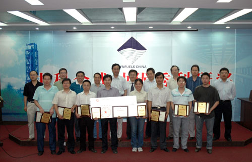 “中科合成油优秀科研奖”是中科合成油技术有限公司在中科院山西煤化所设立的专门奖励优秀在读研究生的奖项,以鼓励所有在读学生在各自的专业中取得更好的成绩。入围本次活动的15名候选人来自煤化所不同的课题组,他们将各自的研究成果向来自中科合成油技术有限公司、中科院山西煤化所、北京大学、天津大学等单位的11名专家组成的评委会做了详细的陈述,并回答了评委的提问。之后,所有评委本着“公开、公平、公正、宁缺毋滥”的原则,从科研水平、创新能力、灵活运用知识能力、口头和书面语言表达能力等方面严格考察每一个候选人,最终黄龙同学以题为“生物质衍生物乳酸和甘油氢解制备丙二醇的研究”的报告荣获一等奖,白书立、吕宝亮、定明月、李四中、王冬华、高强、王辉分别荣获二、三等奖。李永旺总经理、曹立仁总工程师代表公司向八位获奖者颁发了奖状和证书。