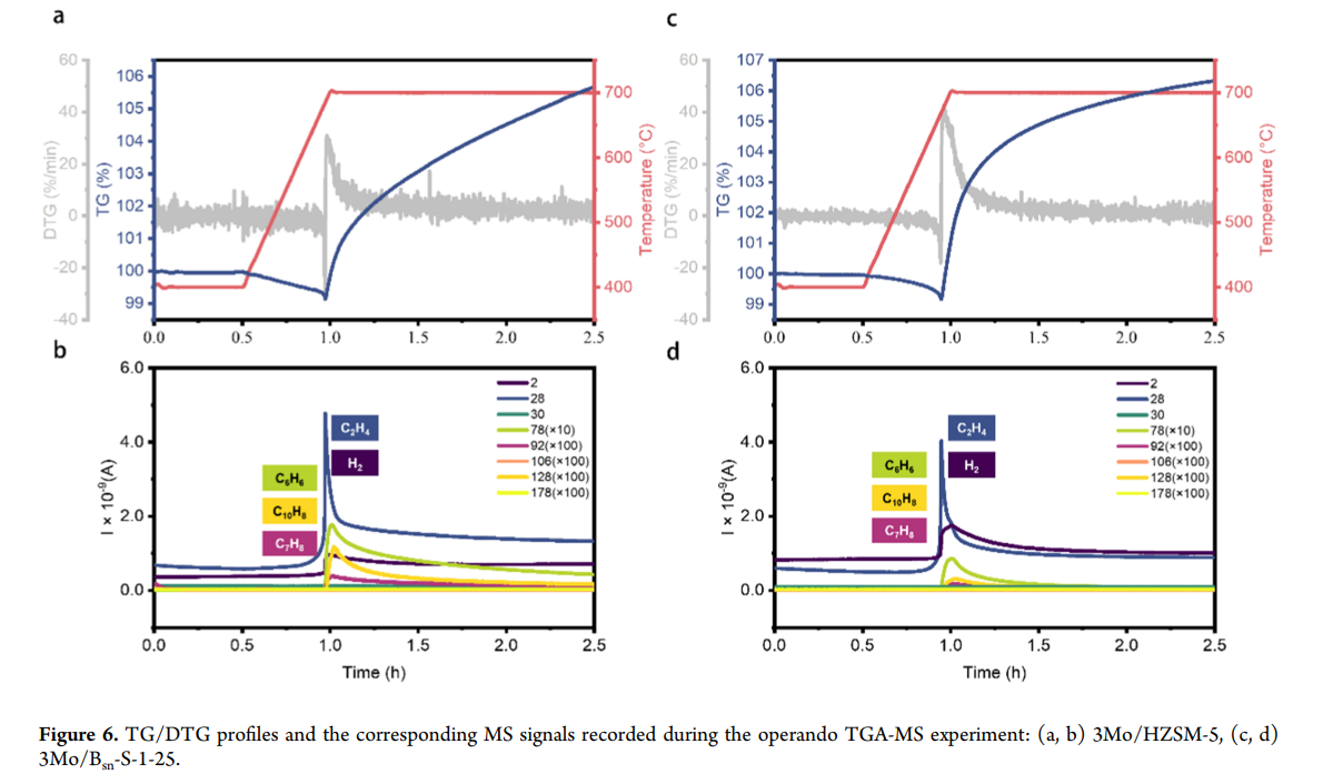 图1. 原位热重-质谱联用(operando TGA-MS)实验所得TG/DTG曲线及对应的MS信号:(a ,b) 3Mo/HZSM-5 ,(c ,d) 3Mo/Bsn-S-1-25.