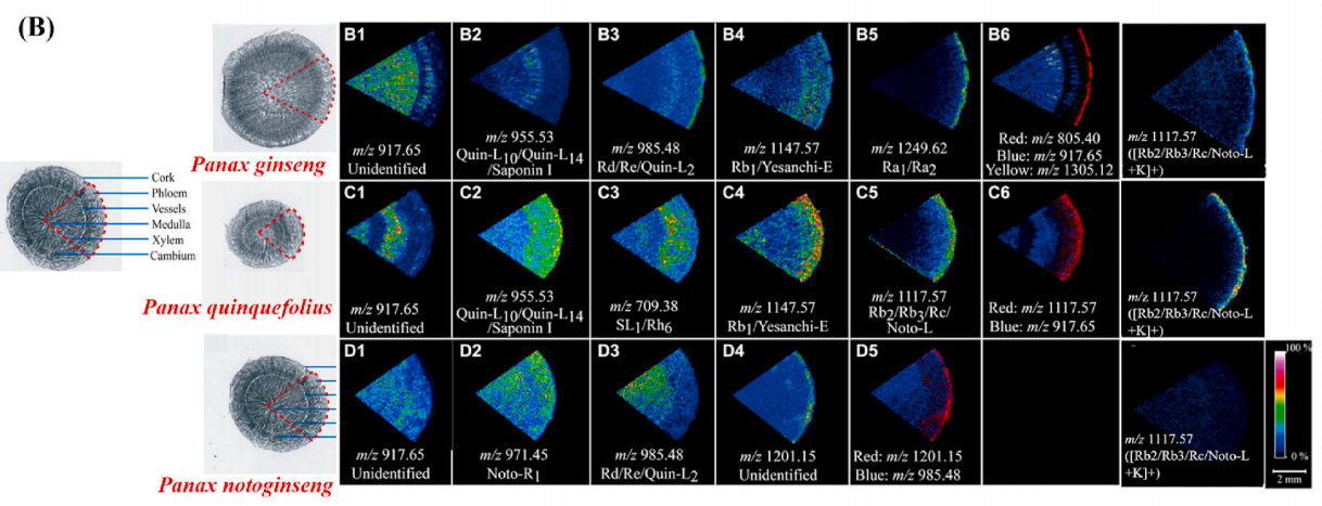 MALDI-MSI能够检测中药中化学成分的分布特征,辅助鉴别中药材的真伪和质量优劣。通过比较不同产地或炮制方法的中药样本,可发现成分分布的差异,为中药质量标准的制定提供新方法。例如,人参、西洋参和三七是人参属中三大主要商业物种,它们形态相似但药理功能各异。不同人参属物种的皂苷定位特征存在差异,为物种鉴别提供了重要依据。而MALDI-MSI能够实现人参皂苷在根组织中的定位分析,并快速区分三种人参属植物。