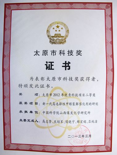 3月2日,太原市2013年科技工作会议在并召开。会上,太原市政府对9个科技工作先进单位、4名科技工作先进个人及60个优秀科技项目进行了表彰奖励。其中,山西煤化所308组承担的“新一代高选择性甲醇裂解催化剂的研制” 项目获太原市优秀科技项目二等奖。
