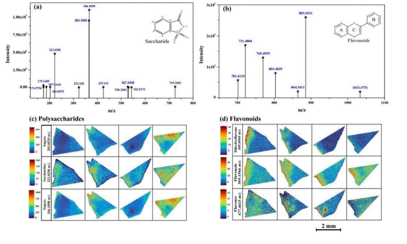 MALDI‐MSI可直观展示中药中有效成分在植物组织中的空间分布。例如,安徽农业大学利用MALDI-MSI技术,揭示了多花黄精(Polygonatum cyrtonema Hua)中黄酮类和糖类的空间分布及其积累规律,其研究结果不仅为黄精的药用价值提供了新的视角,为理解中药成分的合成、转运和积累机制提供了直接证据,还为优化其种植和采收时间提供理论依据。
