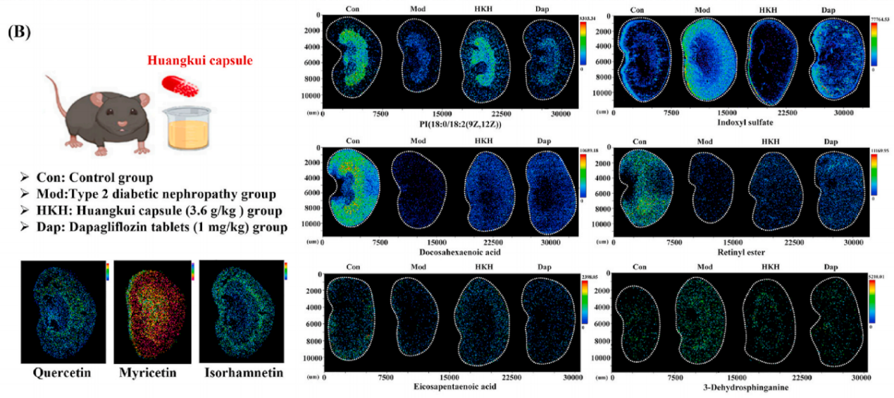通过分析中药成分在靶器官中的分布,结合代谢组学数据,可揭示中药多成分协同作用的药理机制。例如,王喜军和陈香美教授等在研究黄葵胶囊(HHK)治疗2型糖尿病肾病(T2DN)的疗效及机制过程中,借助MALDI-MSI技术准确定位了T2DN核心生物标志物和药物活性成分在肾脏中的空间分布,不仅提高了数据的全面性,还能更直观地展示药物在组织中的作用机制,为阐明HHK治疗T2DN的作用机制提供了新的理论依据。