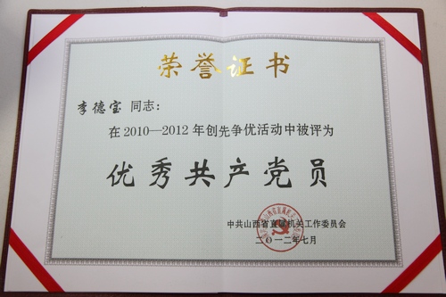 6月26日,中共山西省直工委召开创先争优活动表彰大会。山西煤化所李德宝研究员在山西省直机关2010-2012年创先争优评比表彰活动中荣获优秀共产党员称号。