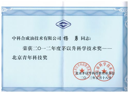 5月18日,茅以升科学教育基金委员会第二十二届科技奖励颁奖大会在南京东南大学举行。中科院山西煤化所煤炭间接液化国家工程实验室副主任、中科合成油技术有限公司研发中心主任杨勇研究员荣获“2012年度茅以升科学技术奖—北京青年科技奖”。