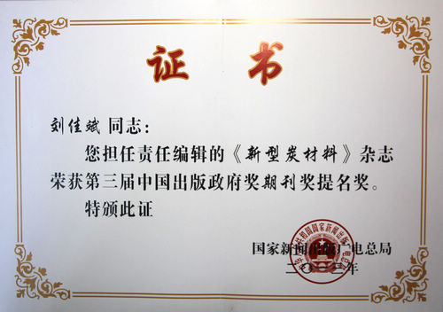 日前,国家新闻出版广电总局公布了第三届中国出版政府奖获奖名单,《新型炭材料》荣获中国出版政府奖期刊提名奖。中国出版政府奖是我国新闻出版领域的最高奖,旨在表彰和奖励国内新闻出版业优秀出版物、出版单位和个人。本届评奖在全国一万多种期刊中共评选出期刊奖20种,期刊提名奖40种。这是继2013年获得全国“百强科技期刊”后,《新型炭材料》荣获的又一重要的国家级奖项。